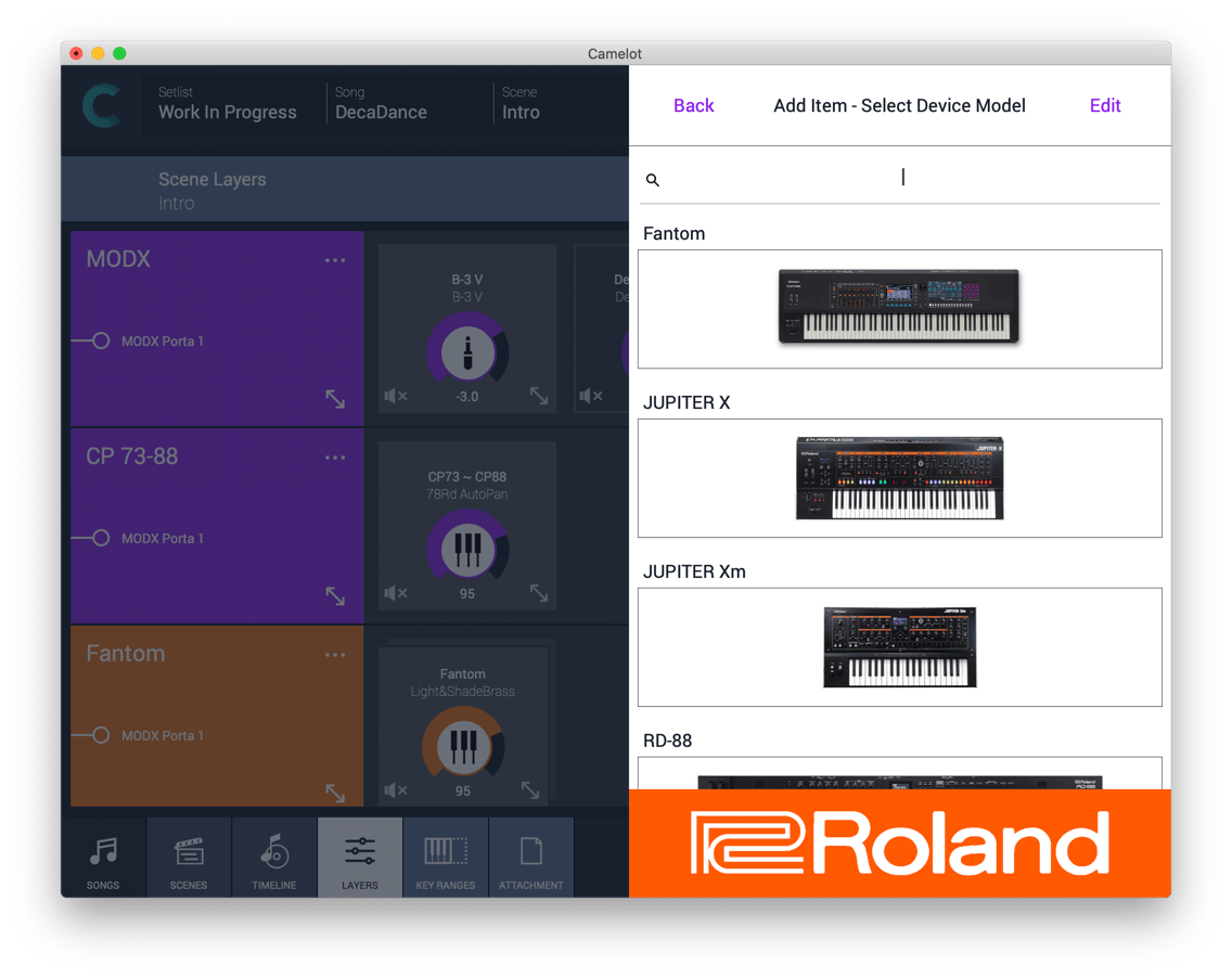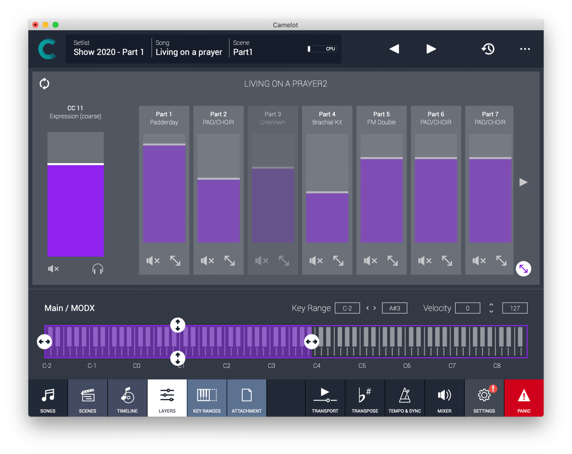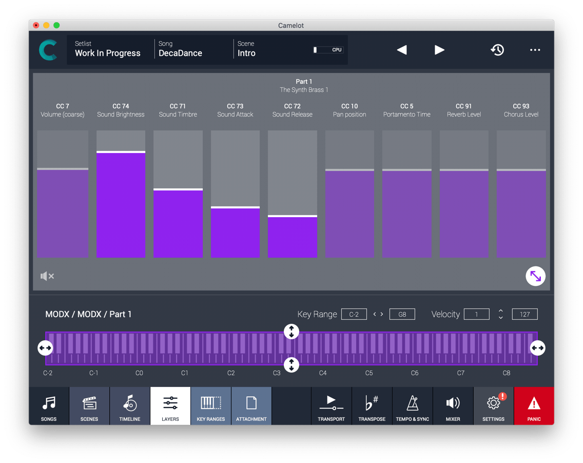 You can switch modes or manage multi-part patches in Camelot without accessing the panel of your instruments.