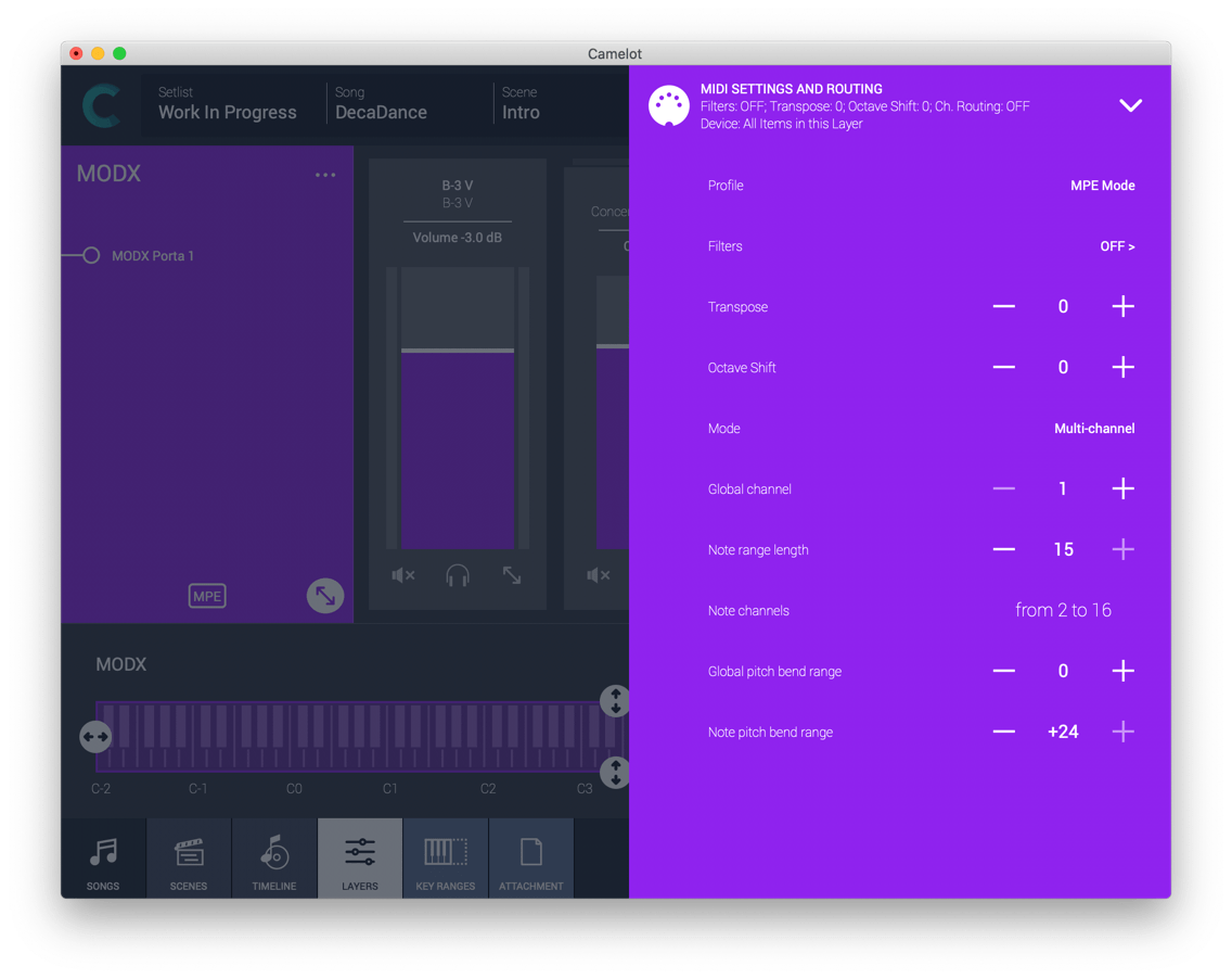 If you are familiar with MPE Controllers, you know that it requires time to build a multipart preset that can be played by them. Camelot allows you to select a sound preset with ease from a multi-part hardware instrument and replicates it to the other MIDI channels with the same pitch bend range and level. Easy.